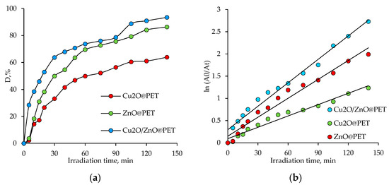 The time-dependent photodegradation efficiency of Czm in the presence of the same amount of composite catalysts (2 × 2 cm2), taking into account the maximum absorbance peak around 285 nm, is shown in Figure 8a. After 140 min of irradiation, 65.3% and 86.4% of the pesticide were degraded in the presence of Cu2O@PET and ZnO@PET catalysts, respectively, while more than 93% of Czm was decomposed when mixed Cu2O/ZnO@PET catalyst was used for the same reaction time. The catalytic photodegradation of Cmz was quantitatively estimated by comparing the apparent reaction rate constants () calculated from the first-order rate equation derived from the Langmuir–Hinshelwood model, expressed as follows [12,14]: