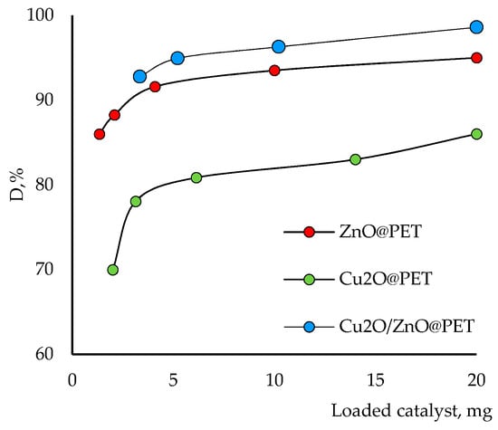 The catalyst dosage is also an important parameter for optimizing working conditions and comparing the effectiveness of catalysts. Therefore, the effects of the active phase of the composite catalyst dosage on the degradation of Czm were investigated at different dosages from 1.3 to 20.0 mg and the results are given in Figure 9. The results indicated that the amount of degradation gradually increased with increasing catalyst dosage over the studied range. On the one hand, as expected, 20 mg catalyst showed the highest photocatalytic degradation efficiency due to the increase in the number of active sites and the high surface area of the composite catalyst. On the other hand, consistent with previous observations, the mixed catalyst showed higher degradation efficiency than the others at all doses, followed by ZnO@PET and Cu2O@PET.