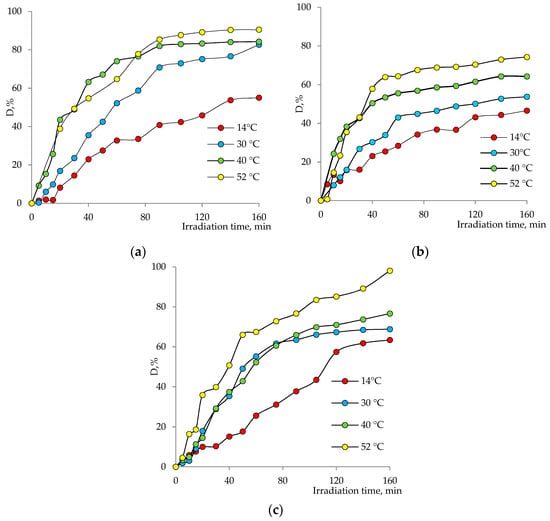 The effect of temperature on the degradation efficiency of Czm was investigated in the temperature range of 14–52 °C (pH = 6, Czm concentration: 1.0 mg/L). The levels of dependence of the pesticide degradation degree on the irradiation time for different temperature regimes and catalysts are shown in Figure 10a–c. From the presented data, it can be said that for all catalyst systems, there is a general tendency to increase in the amount of degradation with an increase in temperature, and after a certain period of time, the degradation tends to reach almost equilibrium at all temperatures. The highest activity in the degradation of Czm over the entire temperature range was demonstrated by the mixed composition catalysts, which catalyzed the degradation of almost all of the contaminant in the medium after 160 min at 52°. Cu2O@PET and ZnO@PET, on the other hand, failed to degrade more than 74% and 90% of Cmz, respectively, under similar reaction conditions. In other conditions, it is also possible to say that the composite catalyst, in general, performs more effectively. Moreover, since all composite catalysts demonstrate undeniable catalytic activity even at very low temperatures (e.g., 14 °C), the developed membrane catalysts seem suitable to be used for wastewater treatment without preheating, especially considering their ease of use. While the lowest values of the reaction rate constant were calculated for Cu2O based composite, Cu2OZnO@PET gave the highest rate constants.