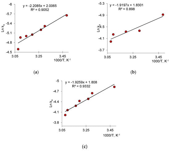 The activation energy EA was calculated using the Arrhenius equation (Equation (5)) and determined graphically from the relation ln ka -(1000/T) (Figure 11):