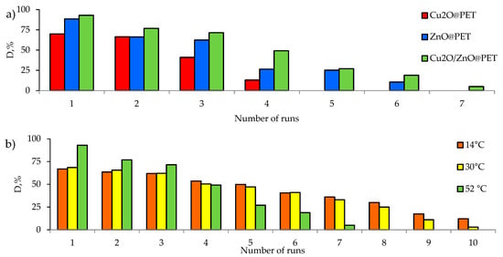 The changes in the crystal structures of the catalysts after the last test cycle were investigated by XRD. It was found that there were significant increases in crystallite size due to the leaching of smaller nanoparticles from the structures. For example, after the 4th test cycle, the degree of crystallinity for Cu2O@PET composite decreased from 53.4% to 42.1%, while the size of the Cu2O crystallites increased from 13 to 35 nm. In the case of Cu2O/ZnO@PET composites, it was determined that a completely amorphous structure remained after the 7th test cycle. However, when repeated cycles were performed at lower temperatures (Figure 12b), we found that the performance of the Cu2O/ZnO@PET composite catalyst remained relatively stable over longer test cycles. The degradation degree, which was actually higher at 52 °C in the first cycle, was outstripped by the lower temperature regimes at the end of the 4th cycle. We attribute this to less catalyst leakage at lower temperatures. As seen in Figure 12b, at lower temperatures, the catalyst was still active at the end of the 10th cycle. Therefore, it can be recommended to use composite catalysts in relatively low-temperature regimes such as 14 to 30 °C for longer repeated operations.