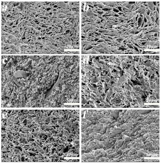 SEM images of GA-MCC-PEI aerogels: (a,b) GA-MCC-PEI-1, (c,d) GA-MCC-PEI-3, and (e,f) GA-MCC-PEI-5.