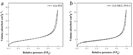 As shown in Figure 2, the Brunauer–Emmett–Teller (BET) isotherms of the GA-PEI and GA-MCC-PEI-3 aerogels both showed characteristics of type IV physical adsorption. Therefore, both the GA-PEI and GA-MCC-PEI-3 aerogels had typical mesoporous structures, which concurred with the dense porous structure revealed in the SEM images. The H3-type hysteresis regression line indicated that voids formed between the mesopores and wrinkled, wide, slit-like voids accumulated in the graphene layer, which induced nitrogen gas eruption during the desorption process [30]. A dense void structure is beneficial because it allows the composite aerogels to achieve the desired adsorption effect quickly and efficiently.