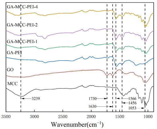 Infrared spectra of GO aerogel, MCC aerogel, GA-PEI aerogel, and GA-MCC-PEI-(1, 3, 5) aerogels.