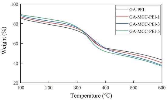 From a comparison of the thermogravimetric curves of the GA-PEI and GA-MCC-PEI-(1, 3, 5) aerogels (Figure 4), as the MCC content increased, the thermal performance of the composite material increased. The stability first increased and then decreased, indicating that the hydrogen bond can enhance the thermal stability of composite aerogels. However, when the MCC content was high (GA-MCC-PEI-5), pyrolysis of a large amount of MCC reduced the thermal stability of the sample. The thermogravimetric loss of 30 wt.% occurred at 322.2 °C for the GA-PEI aerogel, 330.4 °C for GA-MCC-PEI-1, 332.4 °C for GA-MCC-PEI-3, and 326.8 °C for GA-MCC-PEI-5. These temperatures were higher than that (224 °C) for the cotton stalk bark MCC-GO aerogel prepared by Li et al. [38]. In general, the thermal stability of the composite aerogel can be maximized by controlling the MCC content, and good thermal stability can widen the application space of composite aerogels in the field of adsorption.