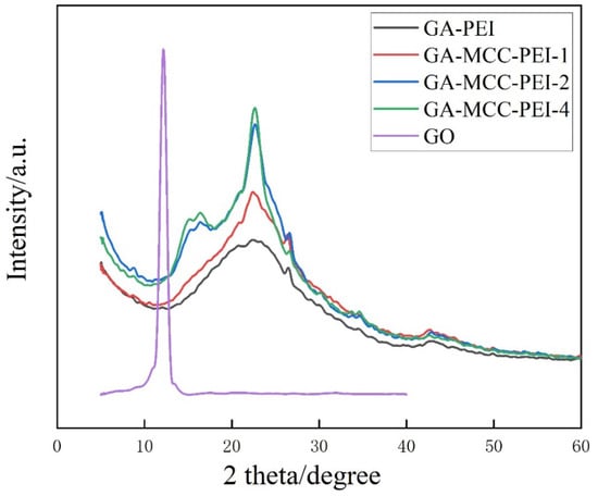 As shown in Figure 5, there was only one peak (11.6°) in the XRD pattern of the GO aerogel, which corresponded to the (002) plane of GO [39]. According to the Bragg equation, the interlayer spacing (d) was 0.76 nm. In the XRD patterns of the GA-PEI and GA-MCC-PEI-(1, 2, 4) aerogels, there were no characteristic peaks of GO. A peak at 22.4° corresponding to the characteristic peak of GA was observed [40]. The calculation showed that its interlayer spacing was 0.39 nm. Therefore, GO was completely reduced to GA, which agreed with the FTIR results. A characteristic peak (16.5°) of MCC appeared in the XRD pattern of the GA-MCC-PEI-(1, 2, 4) aerogels, corresponding to the 10Ῑ facet of MCC [41]. As the MCC content increased, the characteristic peak of MCC increased in intensity and the graphene peak shifted to the left. Therefore, a large number of oxygen-containing functional groups was removed during the reduction of GO, and graphene sheets were re-stacked under the action of π–π interactions, despite MCC inserted between graphene sheets reducing the stacking effect of π–π interactions.