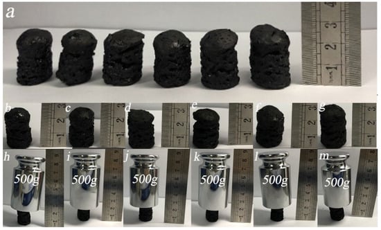 Compression testing of the GA-PEI and GA-MCC-PEI-(1–5) aerogels: (a) photograph of all samples, (b–g) photographs of individual samples, and (h–m) photographs of samples under 500 g pressure.