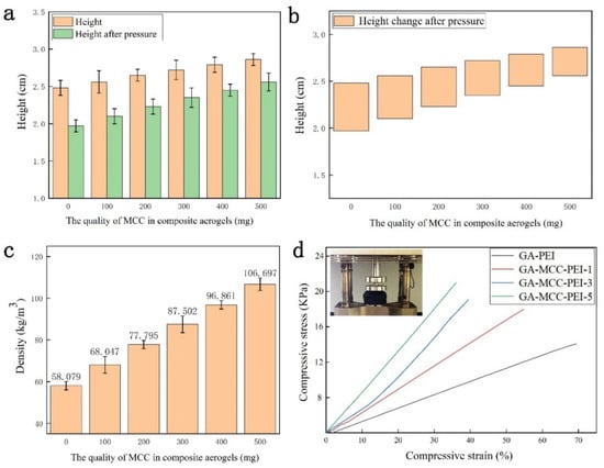 Due to the porosity of aerogels, there is more demand for improving their mechanical properties. As shown in Figure 7a,b, the height of the GA-PEI and GA-MCC-PEI-(1–5) aerogels changed when they were subjected to a pressure of 500 g (approximately 553 times their own weight). Moreover, as the MCC content increased, the height change of the composite aerogel decreased. Among them, GA-MCC-PEI-5 (MCC content of 43%) exhibited the smallest change in height under compression. Therefore, the addition of MCC enhances the mechanical properties of the composite by promoting the formation of hydrogen bonds among PEI, GA, and MCC, as supported by the XRD and FTIR results. As shown in Figure 7c,d, at low MCC contents, the density of the composite aerogel was low and the internal pores were large, and thus the deformation was high. As the MCC content increased, the density of the composite aerogel increased and the size of the pores decreased. The tighter the arrangement of the aerogel, the greater the pressure it can withstand. This also shows that the hydrogen bonding among MCC, GA, and PEI can enhance the mechanical properties of the composites. As shown in Figure 6d, GA-MCC-PEI-5 (MCC-43%) with the highest MCC content had the largest Young’s modulus and was able to withstand a maximum stress of 21.76 kPa, approximately 827 times its weight.