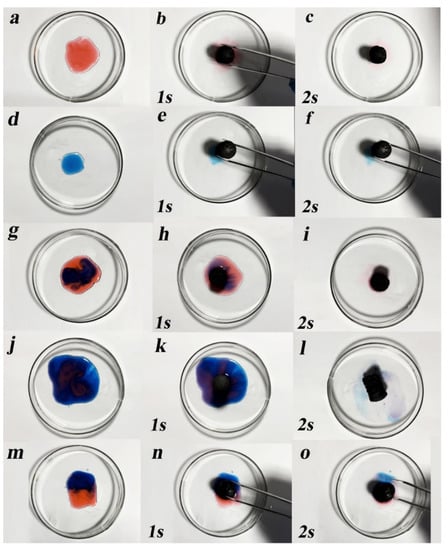 Adsorption capacity of the GA-MCC-PEI-4 aerogel for (a–c) amaranth, (d–f) methylene blue, (g–i) mixture of amaranth and methylene blue (more amaranth), (j–l) mixture of amaranth and methylene blue (more methylene blue), and (m–o) mixture of equal amounts of amaranth and methylene blue within 1 s and 2 s.