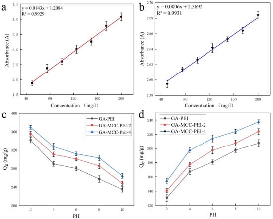Standard curves of (a) amaranth and (b) methylene blue. Adsorption capacity curves of (c, d) GA-PEI, GA-MCC-PEI-2, and GA-MCC-PEI-4 under different pH conditions. Equilibrium absorption capacities for amaranth and methylene blue.