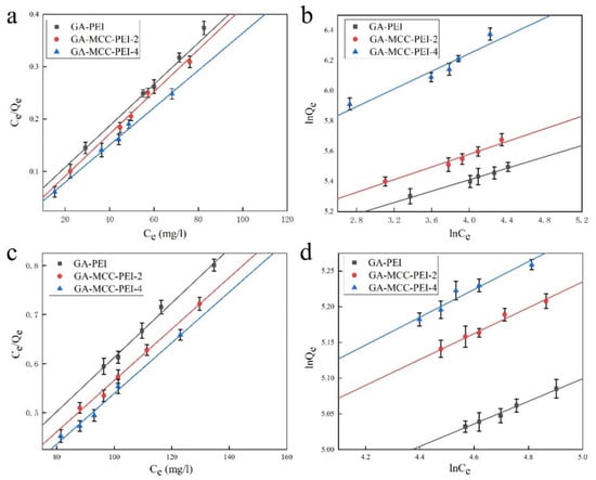 Fitting of adsorption isotherms: Langmuir (a,c) and Freundlich (b,d) isotherms for the adsorption of amaranth (a,b) and methylene blue (c,d) by GA-PEI, GA-MCC-PEI-2, and GA-MCC-PEI-4.