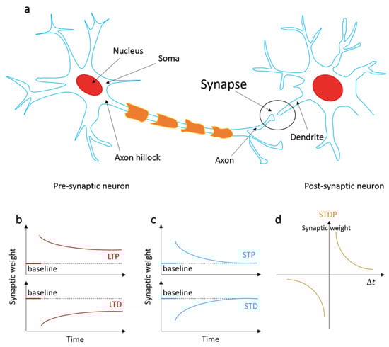 The brain contains billions of neurons, which are highly connected by trillions of synapses [6]. Synapses are small gaps (20–40 nm) between the axon end of the presynaptic neuron and the dendrites of the postsynaptic neuron (Figure 1a) [61]. Neurons generate action potentials (spikes) with amplitudes of approximately 100 mV and durations in the range of 0.1–1 ms in their soma. The spikes propagate through the axon and are transmitted to the postsynaptic neurons through the synapses [10]. The connection weights of the synapses between neurons can become stronger (potentiation) or weaker (depression) through a process called synaptic plasticity, as the brain adapts to new information. Synaptic plasticity is widely believed to play a key role in the learning and memory processes of the brain [61].