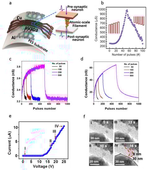 (a) Schematic image of pV3D3-based flexible synaptic device using the formation and rupture of Cu ion-movement-based filament. (b) Potentiation (depression) curve obtained by smart pulse scheme with increasing amplitude in the range of 2~4 V (−1.2~−1.4 V) with a width of 60 ns (100 ns) for a pV3D3-based flexible synaptic device. Reprinted/adapted with permission from Ref. [34]. 2018, American Chemical Society. (c,d) A comparison of potentiation–depression curves of the Ag/SiNx/a-Si/p++ Si-based devices with unimplanted (c) and implanted (d) devices under varying numbers of stimulation pulses of 7.0 (−3.0) V for potentiation (depression). Reprinted/adapted with permission from Ref. [36]. 2020, Springer Nature. (e) Gradual current change and (f) simultaneously obtained transmission electron microscope image of a Cu tip/SiO2/W cell during injection of voltage with increased amplitude. Reprinted/adapted with permission from Ref. [86]. 2017, American Chemical Society.