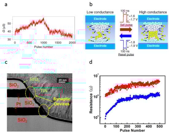 Gong et al. implemented an anion-movement-based filamentary two-terminal synaptic device through a HfO2-based resistive switching device [41]. This device shows analog switching behavior, as shown in Figure 6a. The conductance of the device gradually increases and decreases under 1000 consecutive positive and negative pulses, respectively. The progressive change in conductance in the HfO2-based synaptic device is attributed to the modulation of the oxygen-vacancy-based filament by pulse stimulation. Figure 6b shows a schematic of its operation mechanism. The movement of the oxygen vacancies in response to an electrical signal has a probabilistic nature, which emerges as an inherent randomness in the conductance weight updates, superimposed on the expected signal.