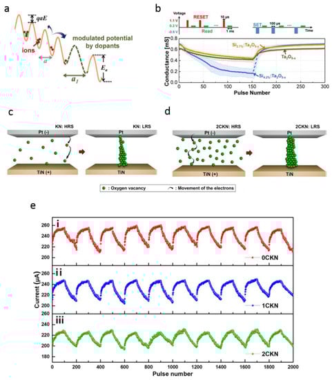 (a) Schematic illustration of nonlinear transport of different field−driven anions through the modulated hopping distances ( and ) for Ta2O5-x layers with different Si doping concentrations. (b) The dynamic range of analog switching depending on the Ta2O5-x layers with different Si doping concentrations under the same pulse train condition. The upward figure shows the consecutive reset and set pulse cycles applied to obtain depression and potentiation curves, respectively. Reprinted/adapted with permission from Ref. [39]. 2014, American Chemical Society. (c,d) Schematics of comparison of HRS and LRS in a Pt/KNbO3/TiN/Si with undoped (c) and Cu2+−doped (d) KNbO3 layers. (e) Potentiation–depression curves of Pt/KNbO3/TiN/Si with different Cu2+ doping concentrations ((i) 0.0, (ii) 1.0, and (iii) 2.0 mol %) in KNbO3 layer with a stimulation number of 100 for potentiation and depression, respectively. Reprinted/adapted with permission from Ref. [43]. 2020, American Chemical Society.