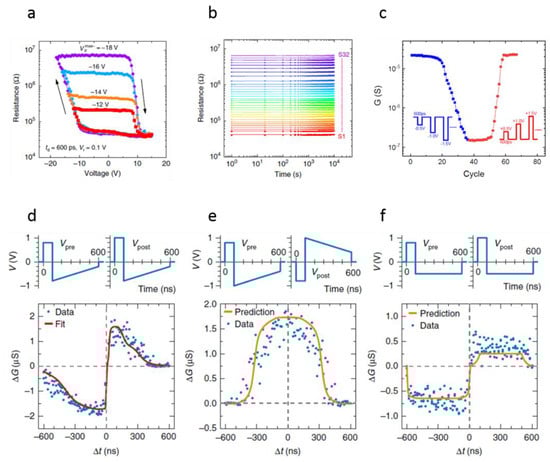Boyn et al. reported that STDP with an operation time of a few hundred ns can be emulated through ferroelectric domain dynamics [45]. To mimic the various types of STDP shown in Figure 8d–f, they applied different pulse waveforms to a synaptic device based on ferroelectric switching. This procedure allows the generation of biologically realistic, accelerated (Figure 8d,e), or artificially designed (Figure 8f) STDP learning curves. In addition, Figure 8d–f show the excellent agreement between the conductance changes predicted using the nucleation-limited model of ferroelectric domains and the measured conductance variations associated with the various types of STDP.