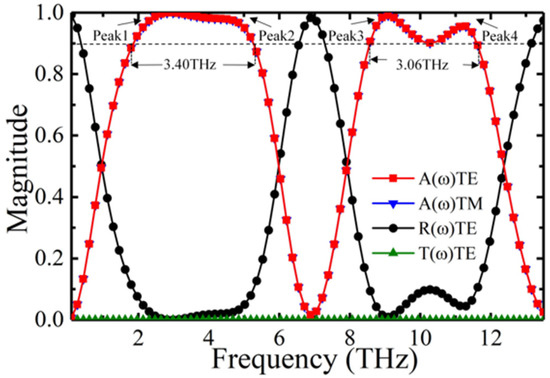 As shown in Figure 1a,b, the schematic diagram of the designed metamaterial absorber, each cell is composed of four vanadium dioxide fillet cavities, a TOPAS dielectric spacer, a vanadium dioxide film, a silicon dioxide (SiO2) layer and gold film from top to bottom. The thicknesses of the vanadium dioxide fillet cavities, the TOPAS, vanadium dioxide thin-films, the silicon dioxide layer and the gold are t1 = 0.3 µm, t2 = 14 µm, t3 = 0.81 µm, t4 = 10 µm and t5 = 0.4 µm, respectively. Figure 1c is a top view of the unit, and the geometric parameters of the vanadium dioxide fillet cavity are L = 21 µm, d = 19 µm, w = 5.5 µm. The composite dielectric constant of the TOPAS is . TOPAS is a transparent, easy to produce thermoplastic copolymer with constant refractive index and negligible absorption coefficient in the terahertz range, which is widely used in terahertz devices. The conductivity of gold and the relative permittivity of SiO2 are S/m and , respectively. The performance of the designed absorber is theoretically studied by using the FDTD method (Lumerical Solutions, Vancouver, BC, Canada). In the simulations, the boundary conditions in the x and y directions are set as periodic boundaries and the boundary conditions in the z direction are set as perfectly matched layers. The absorption can be defined as , where is the reflectance. As the thickness of the gold film is greater than the penetration depth of the THz wave, transmittance is . The optical permittivity of VO2 in the THz range can be described by the Drude model [43,44]: