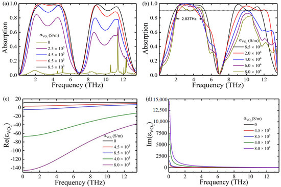 (a) Absorption spectrum of VO2 increasing from S/m to S/m and (b) S/m to S/m. (c) Real parts and (d) imaginary parts of permittivity with different conductivities of VO2.