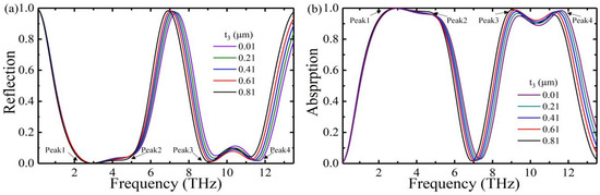 Furthermore, we also investigated the relationship between the reflectance and absorptance of this absorber and the thickness of the vanadium dioxide film. Figure 5a,b shows the reflectance and absorptance of vanadium dioxide at a fixed conductivity of S/m. The results show that when the thickness of the vanadium dioxide film increases from 0.01 µm to 0.81 µm, the two broad absorption bands are red-shifted. As shown in Figure 5a, the reflectance of Peak 1 and Peak 3 gradually decreases, and the effective impedance of the absorber better matches the free space, resulting in increased absorptance of Peak 1 and Peak 3, as shown in Figure 5b. The reflectance of Peak 2 and Peak 4 are stronger and stronger, which causes a gradual mismatch between the effective impedance of the absorber and the free space, so the absorptance of Peak 2 and Peak 4 drops, as shown in Figure 5b. By comparing the reflectance and absorptance of the absorber with the thickness of the vanadium dioxide film, it is found that the absorber performs best at the thickness of 0.81 µm.