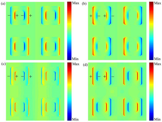 To better explain the absorption mechanism of the dual-broadband absorption, we analyze the electric field distribution at the absorption peak. Figure 6a,c shows the electric field distributions at Peak 1 and Peak 3 when the vanadium dioxide conductivity is S/m. The charge is distributed on the inner and outer sides of the vanadium dioxide in the form of “”, exhibiting the local plasmon resonance phenomenon. Similarly, as shown in Figure 6b,d, the electric fields at Peak 2 and Peak 4 exhibit local plasmon resonance, and the charges are distributed as “” on the inner and outer sides of the vanadium dioxide. It can be seen that the localized plasmon resonance is the main reason for the dual-broadband absorption of the absorber.