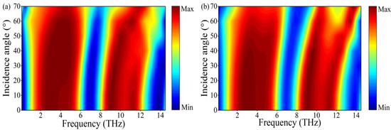 The angle at which the absorber maintains stable absorption under oblique incidence is an important parameter to measure whether the absorber can be applied in practice. Therefore, we investigated the effect of the incident angles of THz waves on the absorptance. Here, we set the conductivity of the vanadium dioxide to S/m and the thickness of the vanadium dioxide film to 0.81 µm. As shown in Figure 7a, the incident wave angle of TE polarization is increased from to , the two broadband absorptions are slightly blue-shifted and a stable absorption bandwidth is maintained in the to range. The high-frequency absorption bandwidth becomes narrower when the incident angle is greater than . The variation of the two broadband absorptions with the TM polarization angle is shown in Figure 7b. As the angle of incidence increases, the two broadband absorptions gradually blue-shift. The broadband absorption at high frequencies splits into two absorption peaks after incident angles greater than , but the absorptance can still remain above 90%. From the above discussion, we can conclude that the structure is a tunable, polarization insensitive and a wide-angle dual-broadband perfect THz wave absorber.