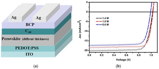 (a) Schematic architecture of the inverted PSCs. (b) J-V characterization of the inverted PSCs with perovskite layer prepared by different concentrations (1.4 M, 1.0 M and 0.6 M) of precursors.