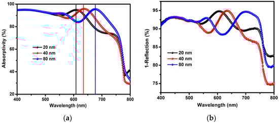 (a) The absorption of the 1 M device with different thickness (20 nm, 40 nm, 80 nm) of C60 ETL calculated by optical simulation. (b) Measured 1-reflection spectra for the 1 M device with different thickness of C60 ETL.