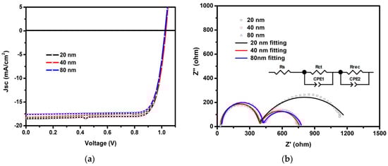 (a) J-V characterizations of the 1 M device with different thicknesses (20, 40, 80 nm) of C60 ETL. (b) Nyquist plots of 1 M devices with the above different thicknesses of C60 ETL. The inset is the equivalent circuit used for fitting.