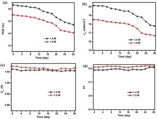 Up to now, we have further optimized the thickness of the C60 ETL in the 1 M device, whose structure is ITO/PEDOT:PSS/perovskite (265 nm)/C60 (20 nm)/BCP (6 nm)/Ag (100 nm), to achieve the best comprehensive performance with a balance between electrical performance and material consumption. In regards to the stability of the 1 M-20 nm device, undoubtedly, stability is still one of biggest challenges for the commercialization of PSCs. Here, the storage stability measurement has been performed on the 1 M-20 nm device without encapsulation for more than 28 days in the glove box. For comparison, the reference device, whose perovskite film was prepared by 1.4 M precursor with 20 nm C60 ETL, was also tested in the same manner. As shown in Figure 4a, both devices undergo a slow and gradual degradation of the PCE values within the test period. After 28 days continuous recording, the PCE of the reference device maintains more than 90% of its initial value, which is further confirmed by the normalized results (see Figure S8a). In particular, a similar PCE degradation behavior is noticed in the 1 M-20 nm device, suggesting the stability is not affected by decreasing the thickness of the perovskite layer covered by a 20 nm C60 ETL. The PCE degradation in both devices is mainly ascribed to the reduction of JSC (see Figure 4b and Figure S8b) because of almost no degradation of VOC and FF (see Figure 4c,d and Figure S8c,d) within the same period. All above stability results confirm good stability performance for the 1 M-20 nm device, which is of benefit to its further commercial application.