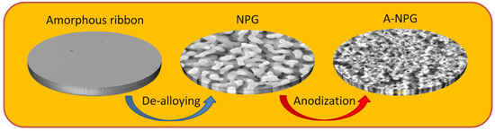 Engineering step procedure for A-NPG: the amorphous ribbon is dealloyed to obtain NPG. Then, anodization of NPG in 0.3 M oxalic acid solution leads to anodized NPG.