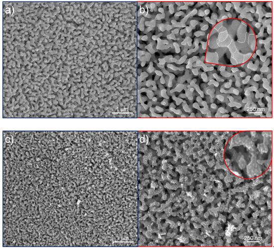 After dealloying, the nanoporous structure presented as a network of ligaments and pores spread over the whole thickness of the ribbon (Figure 2a,b,i). The average size of ligaments was evaluated as 60 nm, measured on the ligament’s neck. Ligaments are polycrystalline, with grain boundaries joining different crystals, as evidenced by dot lines in the inset of Figure 2b; such a morphology results during the dealloying of an amorphous precursor [14], where the mechanism of dissolution of the lesser noble elements and diffusion of the noble one creates gold nanocrystals impinged together, forming ligaments. After 3 min of anodization, the A-NPG sample showed (Figure 2c,d and inset) an increased roughness constituted by asperities and features (less than 10 nm) randomly formed on the surface during the treatment.