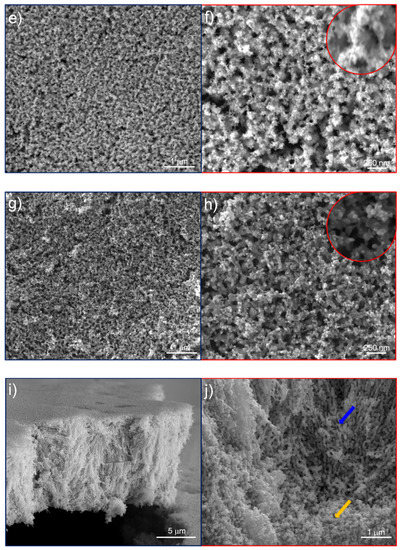 SEM images of the surface of samples: (a,b) NPG; (c,d) 3 min A-NPG; (e,f) 5 min A-NPG; (g,h) 7 min A-NPG. In these insets, an increased level of detail of ligaments is shown; (i) cross-sectional view of NPG; (j) cross-sectional view of the 5 min A-NPG. Anodization involved only a few microns on the nanoporous structure inside the thickness of the ribbon (yellow arrow); the inner part of the ribbon was indeed untouched by the treatment (blue arrow).