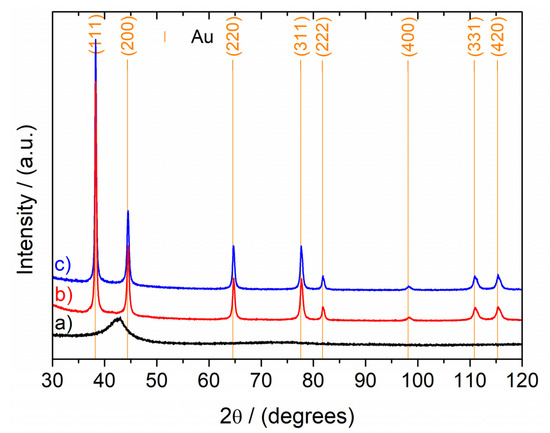 XRD patterns of the as-spun ribbon, NPG, and 3 min A-NPG. The amorphous halo of the as-quenched ribbon (a) disappeared after dealloying treatment, while Au fcc reflections appeared on the NPG (b) and A-NPG (c) patterns.
