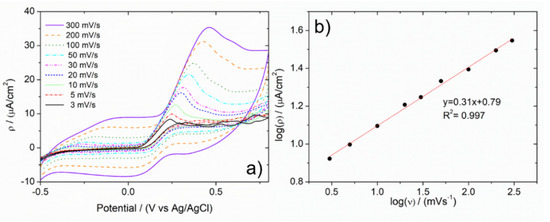 (a) CV scans of 0.02 M ascorbic acid in 0.1 M KH2PO4 solution at 3 min A-NPG electrode as a function of scan speed; (b) plot log(ρ) vs. log(ν) showing linearity trend and diffusive control process.