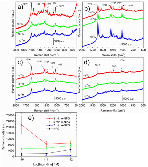 The highest SERS spectra (average of 10 accumulations) of 4,4′-bipyridine at different concentrations on (a) NPG, (b) 3 min A-NPG, (c) 5 min A-NPG, and (d) 7 min A-NPG; (e) Raman intensity at 1616 cm−1 versus bipyridine concentrations (on logarithmic scale). The error bars were calculated from at least five measurements on random spots on the same substrate.