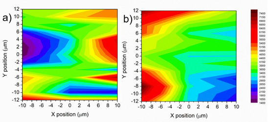 Figure 6a,b report SERS intensity mapping images with bipyridine concentration of 10−12 M on NPG and 3 min A-NPG, respectively. The intensity of the signal was not constant along the surface due to the presence of “hot spots” distributed at random (red regions of the maps). As already observed in a previous study [44], the spot-to-spot intensity variation can be attributed to the localized variation of the electromagnetic field at each “hot spot”, as well as the dynamics and unique environment of a single molecule [26].