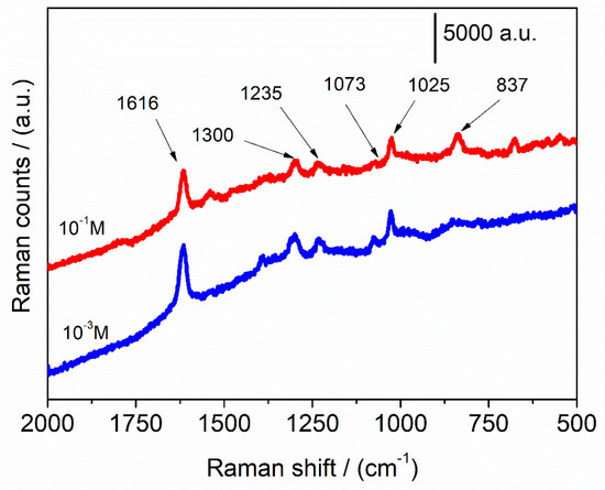 Detection of molecules of interest was successfully attempted for NPG with melamine approaching a detection limit of 10−6 M [29]. In Figure 7, the SERS activity of 3 min A-NPG tested in ascorbic acid aqueous solution is reported; a LOD of 10−3 M was measured for the anodized sample, while NPG did not show any interaction with the analyte and the spectrum, not reported, is a flat line. This further confirmed the higher sensitivity of the A-NPG sample.