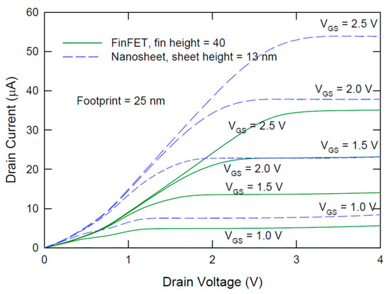 Figure 1 compares the cross-sections of FinFET, vertically stacked GAA nanosheets, and vertically stacked GAA nanowire structure. Figure 2 shows the current–voltage characteristics of a typical FinFET and a single-level nanosheet transistor with the same footprint of 25 nm and headroom of 40 nm. Both transistors have a top (horizontal channel in <100> direction and the sidewall channels in the <110> direction. Because of the larger effective channel width and the advantage large portion of the horizontal channel with higher effective mobility, the nanosheet transistor shows a significantly larger drain current. The drain current is 1.6 times at VGS = 2.5 V and VDS = 4 V. Three issues can be derived by a quick evaluation of the characteristics and structures of both devices:
