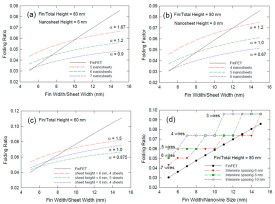 To have a more intuitive view of the effects of various parameters. We compare in Figure 3 the folding ratio of various FinFETs, vertically stacked nanosheets, and vertically stacked nanowire transistors. In Figure 3a,b, we assume the fin height is 80 nm. This fin height should be feasible and will be likely to be adopted for manufacturing in some future technological nodes [24]. For the FinFET structure, the folding ratio ranges from about 0.03 to about 0.087 for fin width increasing from 5 nm to 15 nm. In Figure 3a, we assume the sheet height is 6 nm. In the nanosheet transistor reported by the IBM group, the sheet height is reduced to 5 nm. Yet 5 nm thick could be the ultimate scale for nanosheet technology from the geometrical point of view. It was reported that there is a significant reduction in electron mobility when the silicon nanowire is reduced to 5 nm [25]; then, the benefit of scaling will be significantly discounted. Thus, we prefer to use 6 nm as the lower bound of nanosheet height. If the 80 nm headroom can accommodate 5 nanosheets, then the intersheet spacing is 10 nm, the same value reported by the IBM group [15]. Under this situation, the α value is 1.67 and the nanosheet structure is better than FinFET only when the fin width is larger than 10 nm. If we are going to squeeze 6 nanosheets or even 7 nanosheets with the same sheet height of 6 nm into the 80 nm tall fin, then the intersheet spacing needs to be reduced to about 7 nm and 5.4 nm, respectively. That requires the gate oxide thickness to be reduced to less than 2.5 nm and that technology has not been reported. Even if the technology is possible, VNSFET technology has the advantage of a better folding ratio only when the fin width is larger than 7 nm and 6 nm, respectively. Yet a more practical option based on the present technology is to use an 8-nm-thick nanosheet. Figure 3b shows the case of 8-nm thick for 4, 5, and 6 nanosheets incorporated into the 80-nm-tall fin. The α values are 1.2, 1.0, and 0.67 which correspond to the intersheet spacing of 12 nm, 8 nm, and 5.3 nm, respectively. As mentioned, the 5.3 nm seems not to be practical from the technical point of view. For 12 nm and 8 nm spacing, they should be achievable and the VNSFET structure is preferable only when the fin width is larger than 12 nm and 8 nm, respectively. Hence, the nanosheet technology could be a cost-effective option for foundries that are not able to pattern a fin structure smaller than 8 nm. Yet, 80-nm fin height is not very mature to certain foundries, for 60-nm-tall fin height (see Figure 3c), the sheet height between 6 to 8 nm and intersheet spacing of 7 to 9 nanometers could be an achievable technology. Then, the nanosheet structure does show an advantage for fin width larger than 7 or 9 nm.