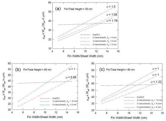 Figure 5a compares the 60-nm-tall FinFET with a VNSFET of the same height. For FinFET, since the effective width is mainly contributed by the sidewalls, changing the fin width has little effect on the effective mobility-width product value. If the number of sheets is 3, the VNSFET shows to have an advantage (larger effective mobility-width product) for sheet width larger than 14 nm. This breakeven point agrees with what was predicted in Equation (21). If the sheet height is reduced to 8 nm, and 4 nanosheets can be incorporated into the 60-nm headroom, then the VNSFET has a better MWP for sheet width larger than 10 nm. When Wfin = 10 nm, Hfin/Wfin, = 6, and n ≈ 4 according to Equation (21). That agrees with this plot. If a more advanced 80-nm-tall fin can be etched, the nanosheet height can be further reduced to 6 nm, and the intersheet spacing can be extremely scaled down to 7 nm, then the breakeven point of nanosheet structure is still stalled at 10 nm (See Figure 5b). If the process can incorporate 5-nm-thick sheets into the 80 nm headroom, then the breakeven point is about 12 nm. These results again suggest that the vertically stacked nanosheet structure is favorable only to some less-advanced fabrication processes. It could be an attractive option for pushing the existing 10 nm or 14 nm technology a couple of generations further and that is what has been demonstrated in the literature [15]. However, it does not have much benefit for the foundries that already achieve the 5 nm FinFET-based technology with fin height greater 60 nm and footprint/fin width of about 10 nm. Nevertheless, the VNSFET structure is not likely a technological option for 3 nm technology and beyond.