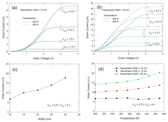 (a) Experimental current–voltage characteristics of a 10 nm width single layer nanosheet FET measured at 300 and 400 K; (b) current–voltage characteristics of 25 nm width nanosheet FET measured at 300 and 400 K; (c) plot of drain current as a function of sheet width; (d) temperature dependence of drain current for nanosheet FET with different sheet width. The gate length of the device was 2 μm.