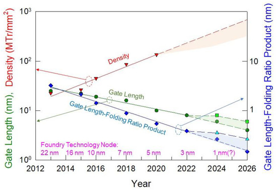 Based on the study presented here together with the technological constraint of gate dielectric engineering and dry etching, we are inclined to believe that vertically stacked nanosheet structure is not a favorable option for “3 nm technology” and beyond. FinFET should still be a sustainable option that can be maintained by further increasing the aspect ratio (fin height-to-fin width ratio). Figure 7 shows the trend of the technology nodes since the introduction of the FinFET structure or 22 nm node [18]. Moore’s law in the chip density upscaling rate, taking Apple mobile CPU as an example, is still maintained so far. The increase in chip density does rely not only on the gate-length shortening, it is also achieved with the increased gate-width folding. The gate-length reduction rate had been slowed down to about 0.88 to 0.9 instead of the historical rate of about 0.7 per generation. For Intel’s “22 nm” technology, the actual gate length is around 25 nm. Additional scaling toward the “22 nm” specification was contributed by the gate-width folding. A better folding ratio was obtained by folding ratio by increasing the fin height and reducing the fin width. When approaching the EUV lithography limit, it is expected that the pace of gate length-shortening will go even slower, but we expected that Moore’s law will still maintain for a couple of generations. The gate-length scaling may be stalled at 6 nm or 8 nm not only because of the limit of EUV but also because of the effect of surface roughness scattering, as mentioned. If it is the case, the gate-length scaling shall be slower than the present rate (see the square markers of the gate-length line) and the product of the gate-length-folding ratio will be larger (see the triangular markers of the gate-length-folding ratio product curve). The smaller footprint can be achieved with a taller fin. A fin at 80 nm tall will be introduced in a couple of years. The ultra-tall fin of 130 nm may also be possible and “2 nm”, and “1 nm” technology can be achieved by scaling both the fin width and gate length to 6 to 8 nm.