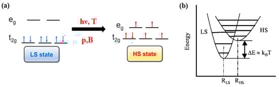 (a) The electronic configuration of low spin (LS) and high spin (HS). (b) The relative potential energy diagram of low spin (LS) and high spin (HS) states. Reprinted with permission from Ref. []. Copyright 2004 Springer.