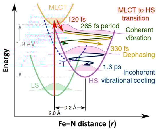 The schematic representation of structural dynamics of [FeII(bpy)3]2+ in solution during the light induced spin state conversion with respect to the Fe-N distance reaction coordinate. The decay of the metal-ligand charge transfer (MLCT) state occurs with 120 fs with energy dissipation. The system then undergoes a coherent vibronic decay (at 265 fs) followed by a damping with a time constant of 330 fs. The vibrational cooling occurs within 1.6 ps [].