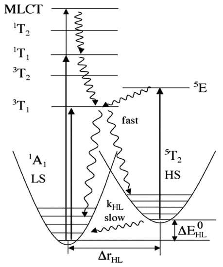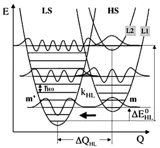(m + p = m’) is the tunneling probability for a non-radiative process from a vibrational level m in the high spin to a vibrational level m’ of the low spin state (as schematically indicated in Figure 12) [,]. Here p is the reduced energy gap, a dimensionless measure of the vertical displacement of the potential wells, equal to Δ/ℏω. The vertical displacement of the potential wells Δ is the zero-point energy difference between the LS and HS states. At low temperatures tunneling occurs from the lowest vibrational level of the high spin state to the low spin state and the relaxation constant is given by Equation (5) [,].