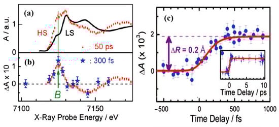 Femtosecond XANES studies showed that the population of triplet metal ligand charge transfer state 3MLCT relaxes to the high spin state 5T2, directly, bypassing the 1,3T intermediate states [], as indicated in Figure 3. The pump and probe K-edge XANES spectra obtained for LS state (black solid line) and for HS state obtained after 50 ps delay (red dots) is shown in Figure 4a and are indicative of an increasing HS state population and Fe-N bond distortion. The transient XANES spectra recorded at 50 ps time delay and 300 fs time delay are shown in Figure 4b. There is an increment in the absorption intensity at around 7126 eV in Figure 4a which is called the B-feature []. This multiple scattering B-feature is attributed to Fe-N bond elongation associated with LS to HS spin state transition. Elongation of the metal to ligand bond length (Fe-N) is an easily identified structural change that occurs with the spin transition in Fe(II) SCO complexes [,]. The average change in the Fe-N bond length associated with the spin transition phenomena is about 0.2 Å with respect to the ground state. This structural signature of the spin state transition means that time resolved X-ray scattering can be used to probe the spin crossover dynamics.