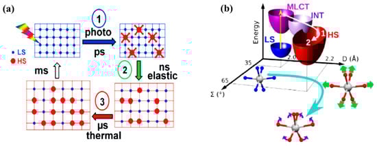(a) A schematic drawing of the multiprocess switching dynamics of solid SCO materials []. (b) The schematic representation of the pathway from low spin to high spin [Fe(phen)2(NCS)2] crystal with the 2D vibronic states (D—elongation and Ʃ—bending) is indicated. The fast intersystem crossing (1), through intermediate states, drives the Fe-N elongation (2) with the generation and damping of the breathing mode followed by the activation bending mode (3). Reprinted with permission from Ref. [] and Ref. []. Copyright 2009 and 2014 by the American Physical Society.