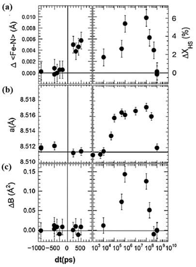 The HS state fraction can also be increased by the overall sample volume expansion or pressure within the sample. There are two contributions to this volume expansion in a solid (poly-molecular condensed matter) sample. One is due to the elastic effects generated by the photo-switching of molecules from the LS to HS state, and the second one is due to the thermal lattice expansion. In Figure 7b, a delay of about 50 ns (for 100 µm laser spot size and typical sound velocity of 1000 ms−1) is observed before the initial photo-induced HS fraction is sufficient to result in a reorganized molecular structure that can trigger the switching of other molecules. This 50 ns time delay corresponds to the time scale required by acoustic wave propagation in a thin crystal. This is followed by a slower intramolecular lattice expansion in the 100 ns to 100 µs region. This second contribution to intramolecular expansion (and associated molecular volume change) is hypothesized as due to the thermal lattice expansion resulting from the energy of the laser pulse that increases the local temperature []. In addition, the penetration depth of the laser is finite, and this can cause local temperature gradients. The homogenization of the temperature across the crystal takes time and appears to occur within 10–100 µs []. This was confirmed by measuring the evolution of the isotropic Debye-Waller temperature factor ΔB with time (Figure 7c), as an indicator of the atomic thermal motion [].