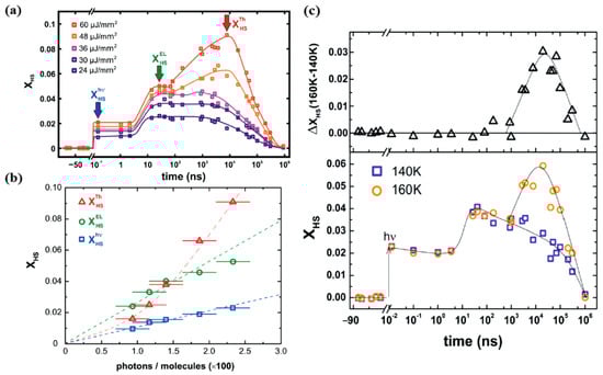 A study performed by Betorni and coworkers [], for different incident photon densities, on [Fe(phen)2(NCS)2] orthorhombic crystals, confirms the three steps model for conversion to the HS state at 140 K, as illustrated in Figure 8a []. Both the photoinduced and elastic steps appear for all excitation energy densities employed, while the thermal step only appeared for excitation energy densities exceeding a threshold of 40 µJ mm−2, in the 10 µs time scale.