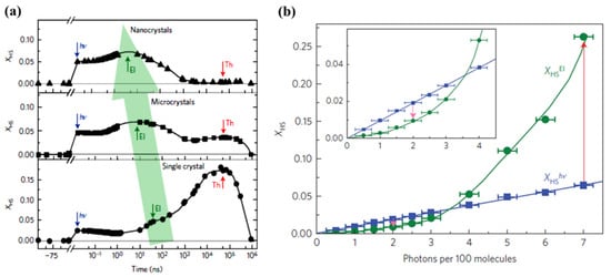 (a) The response of different sizes of low spin FeIII(3-MeO-SalEen)2]PF6 crystals to a femtosecond laser excitation, top panel: nanocrystals, middle panel: microcrystals, and bottom panel: single crystals. The photoinduced step, the elastic step, and the thermal step are denoted as, hν, El, and Th respectively. The green arrow indicates the elastic step shift towards the shorter time scale with the crystal size reduction. (b) The high spin fraction XHS formation due to photoinduced (measured at 10 ps) and elastic step (measured at 100 ns) with laser excitation energy density scaled in photons per 100 molecules. Reprinted with permission from Ref. []. Copyright 2016 Springer Nature.